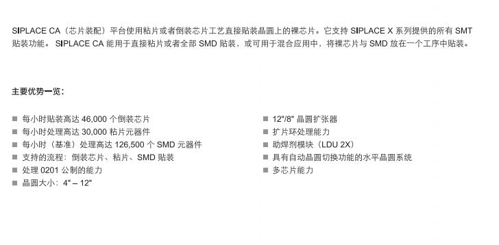 借助SIPLACE CA,将倒装芯片(FC)和芯片贴装(DA)等未来高速增长的技术集成到您的SMT生产中,SIPLACE CA是首个高速贴装平台,您可以灵活地将直接从晶圆上进行裸芯片贴装与传统的基于供料器的SMT贴装相结合。 您的竞争优势:新的、面向未来的应用可以在一条SMT生产线上实现,而无需任何额外的特殊流程。它是“先进封装”应用的理想机器。另一个优势是:对于所有其他作业,SIPLACE CA可以作为一个强大的“普通”SMT榴莲视频APP在线观看播放