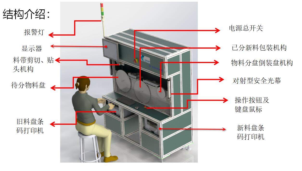 简介: .通过料盘扫码自动连接 MES 系统,核对并确定分料数量 .自动精确计数分盘 ,实现大盘料分小盘料,整数盘分定数盘 .自动包装,减少人员依赖程度,减轻企业用工负担。 .自动生成新条形码打印张贴,便于识别与追溯,提高管理效率。