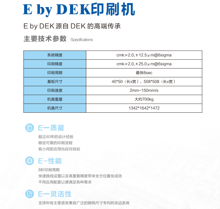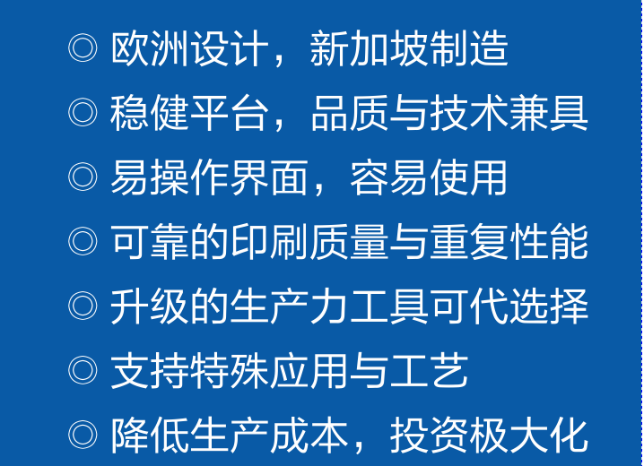 Eby DEK印刷机,欧洲设计,新加坡制造。稳健平台,品质与技术兼具,易操作界面和容易使用。可靠的印刷质量与重复性能。