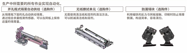 从锡膏瓶下面的孔自动供给锡膏。通过组合余量检测传感器,可以在网板上保持适量的锡膏量。